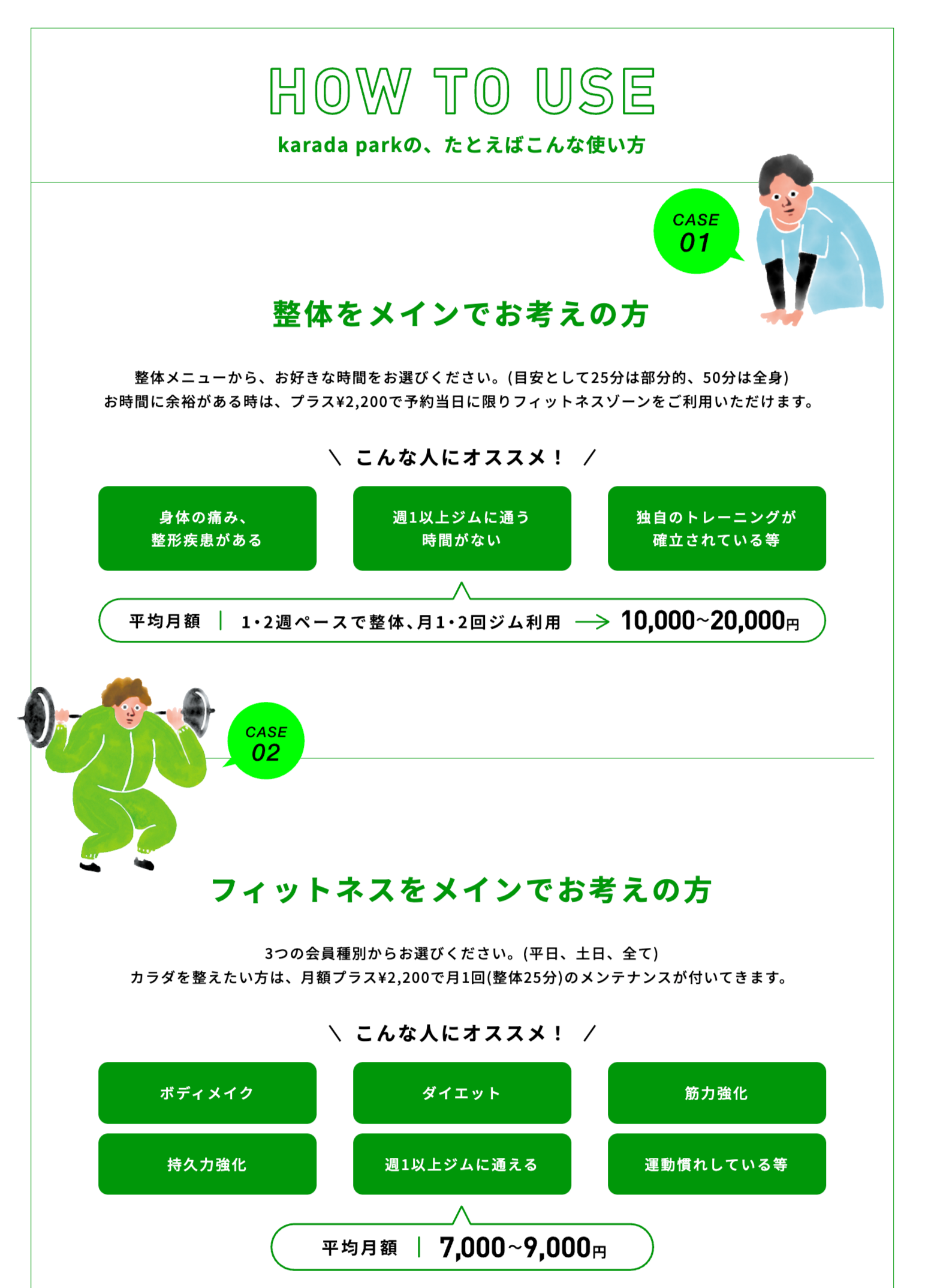 私自身、整体の学校に通いながらフィットネスジムでアルバイトをしていた経験から、フィットネスの良さも知っていました。「体を整えて、トレーニングできる体にして、最終的には自分で体を整えられるようにする」。そのループを実現したく、独立してカラダパークを立ち上げました。
